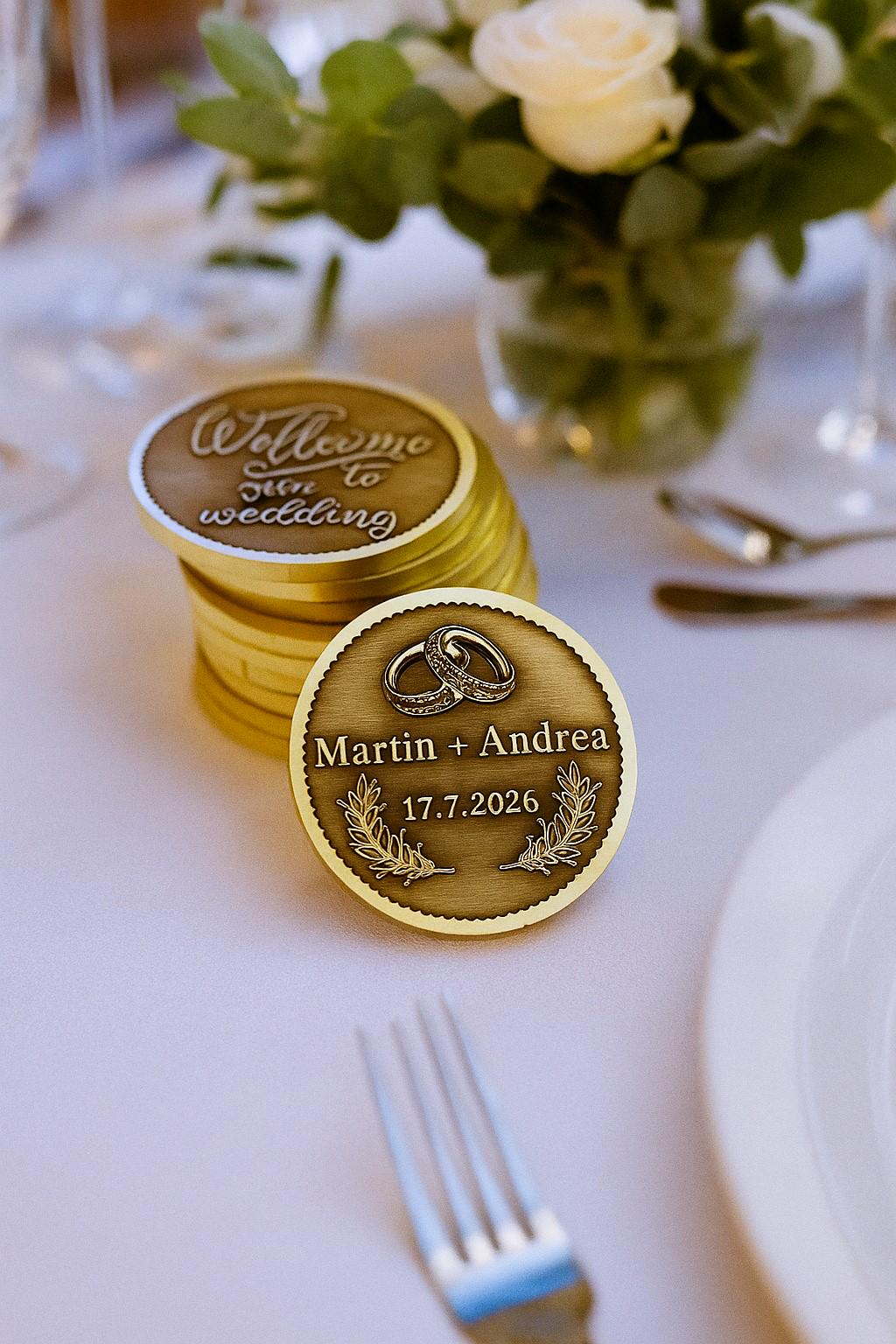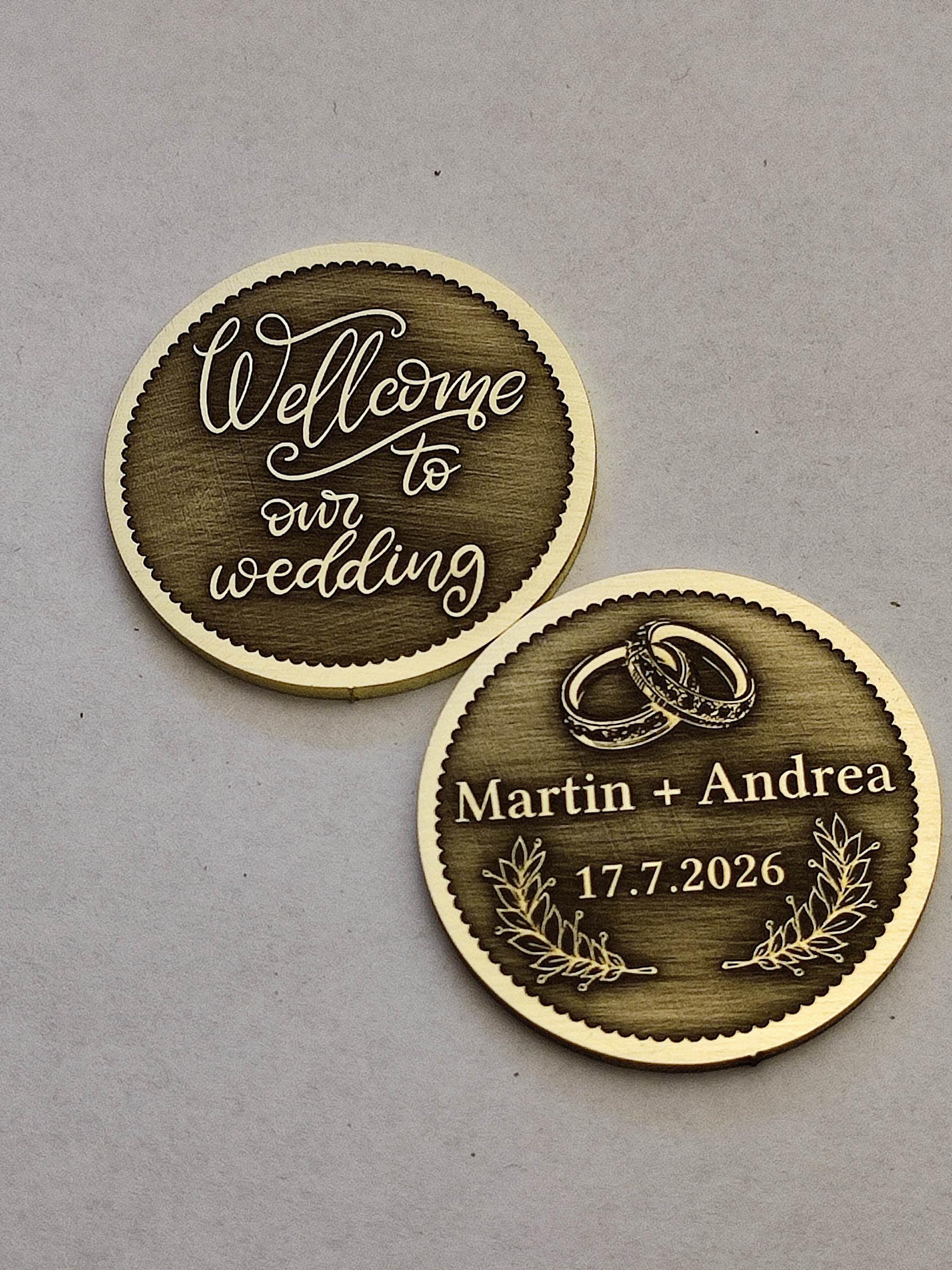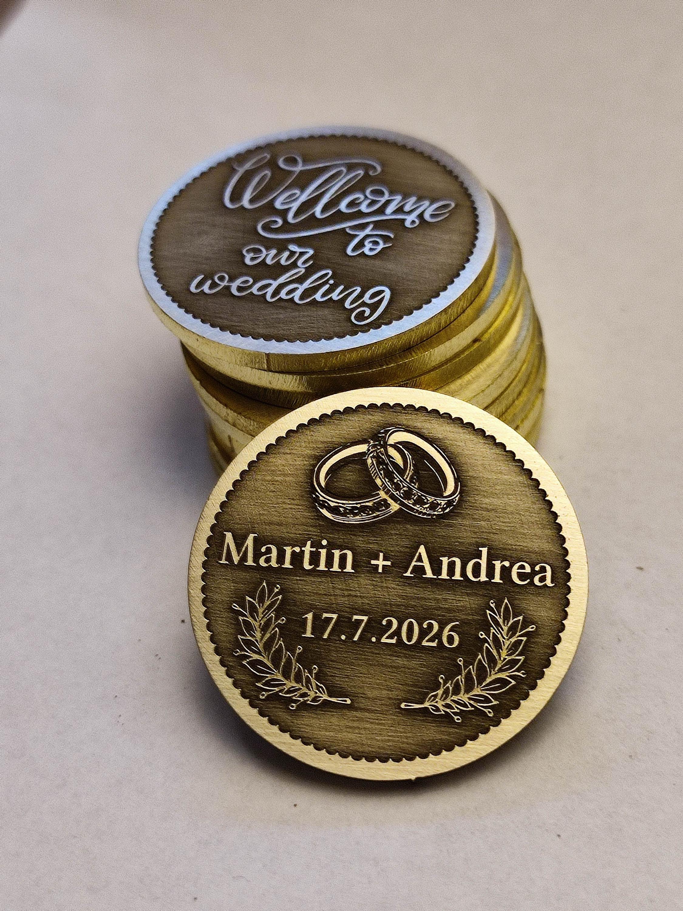 Commemorative tokens are a nice touch for wedding guests and an original addition to wedding decorations. The tokens can be customized by adding your wedding date, the names of the newlyweds, or a motif of your choice to match the style of your wedding. From romantic and rustic to modern and minimalist. Double-sided engraving